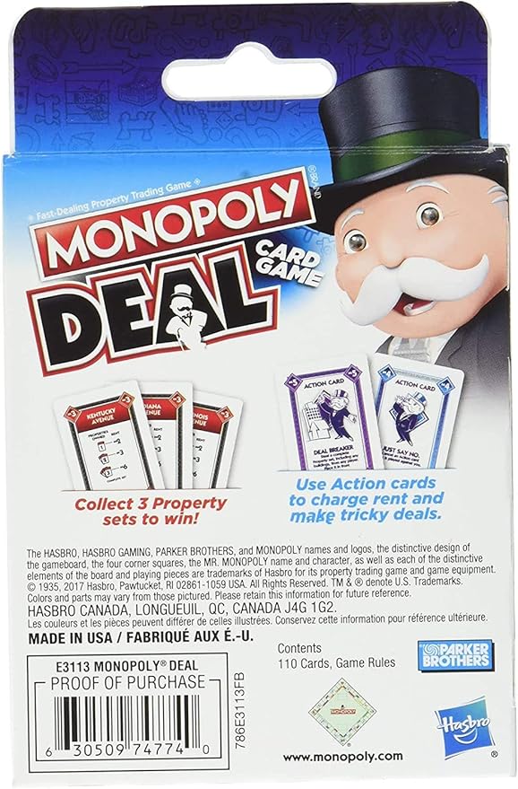Mono Deal, is a fast-paced card game based on the classic board game, where the objective is to be the first player to collect three complete property sets of different colors.